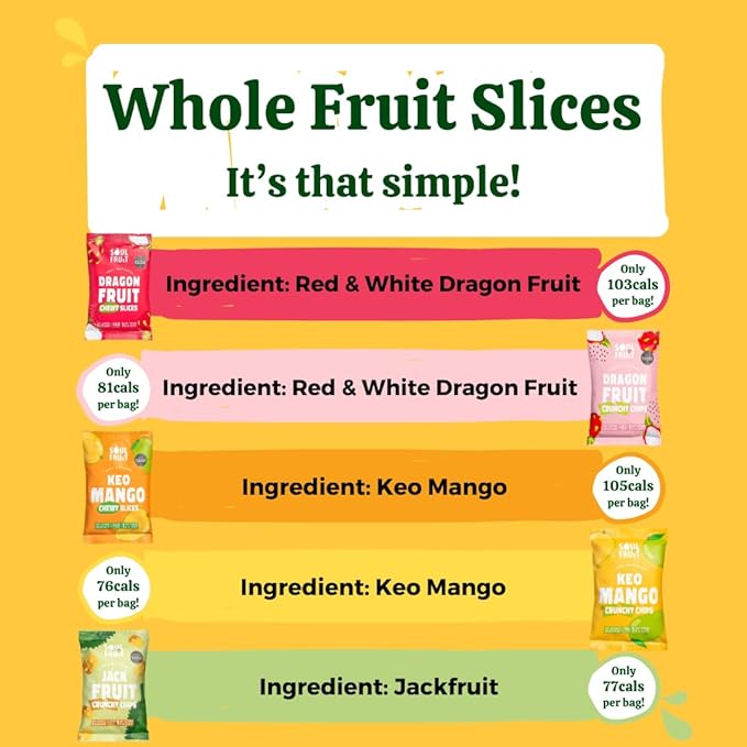 • DISCOVER OUR RANGE OF DRIED FRUIT: Try our entire range of dried superfruits in this handy snack box. Every box contains 2 x Soft Dried Dragon Fruit, 2 x Dragon Fruit Chips, 2 x Soft Dried Keo Mango, 2 x Keo Mango Chips, 2 x Jackfruit Chips. All are nutrient dense and full of fruity flavour and goodness!