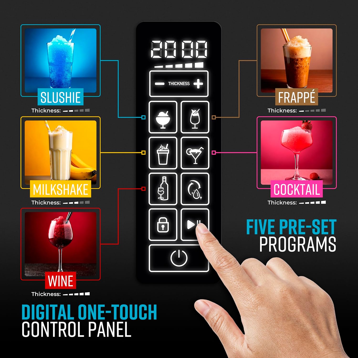 - DIGITAL DISPLAY WITH 5 PRE-SETS: Easy to read LED display allows you to choose from five drink pre-sets. Slush, Cocktail, Frappe, Milkshake and Wine settings automatically program the slush maker for your convenience, whilst manual controls allow you to adjust the thickness to suit your preferences